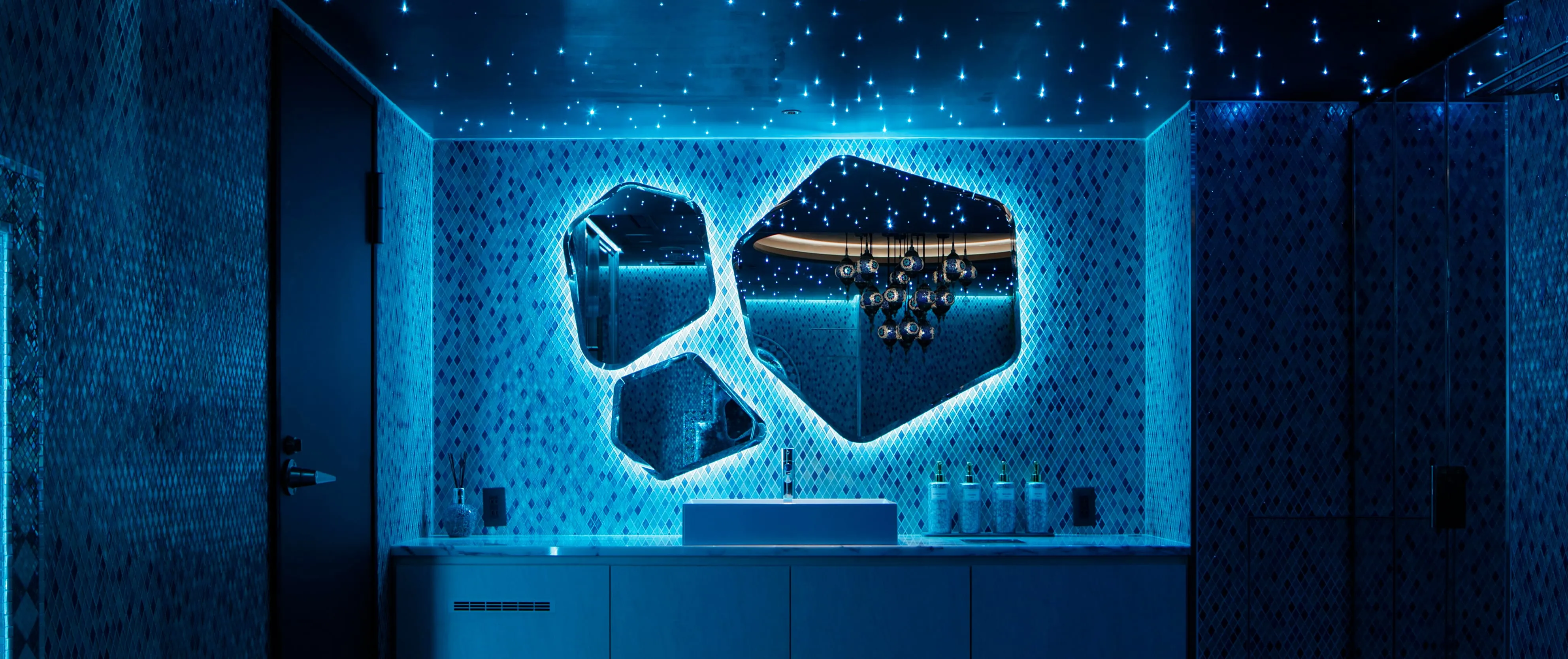 波をイメージしたライトが施されたサウナ室はゆったりと寝そべって入れる仕様で、まさに海底にいるような感覚を味わえます。神秘的な空間の中にインフィニティチェアと回転式ラウンドソファを設置。時を忘れてお寛ぎいただけます。