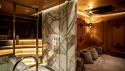 個室内に水風呂を備えているため、周りを気にせず独り占め。広さと深さにもこだわり、水温も自分好みのものを選択できます。