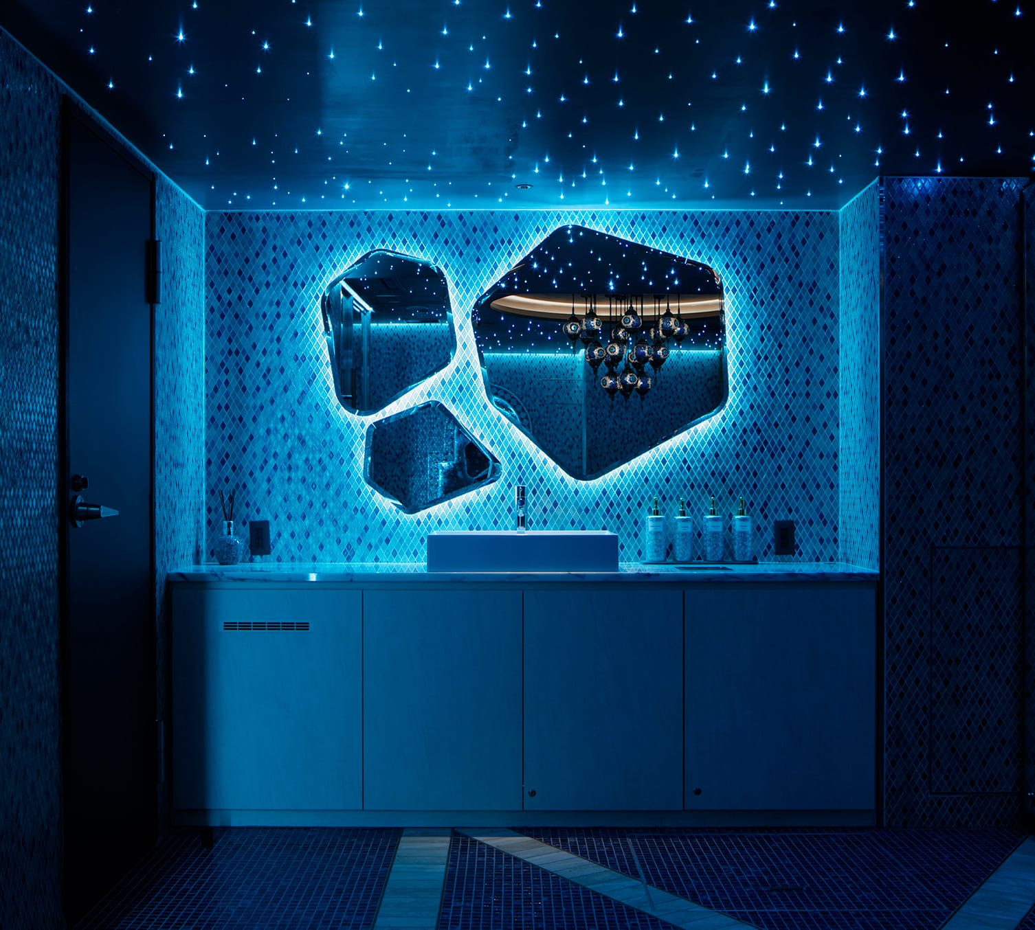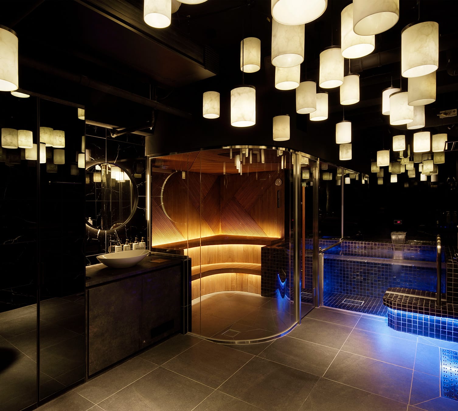 波をイメージしたライトが施されたサウナ室はゆったりと寝そべって入れる仕様で、まさに海底にいるような感覚を味わえます。神秘的な空間の中にインフィニティチェアと回転式ラウンドソファを設置。時を忘れてお寛ぎいただけます。